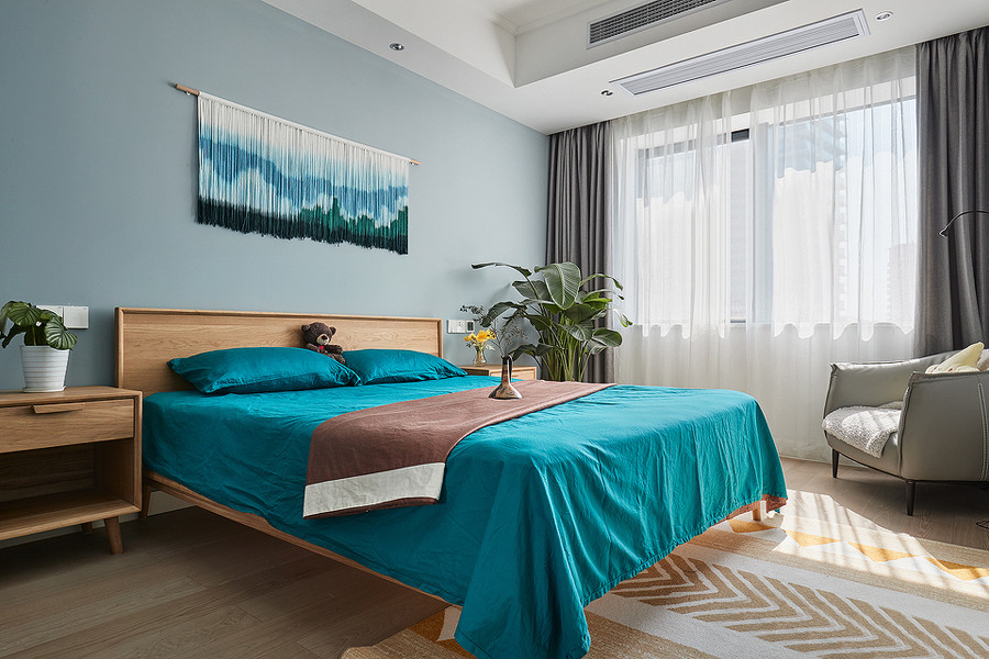 ▲ 主臥,白綠相間成為了將整個空間連接的線索,從原木的床到湖藍色的床品,讓臥室顯得清爽舒適。