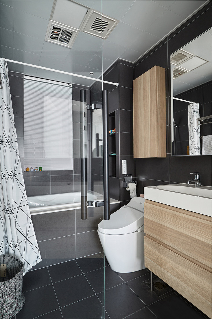 ▲ 衛(wèi)生間鋪設(shè)了深灰調(diào)的墻地磚,配以溫潤的木質(zhì)柜體,簡約時尚。