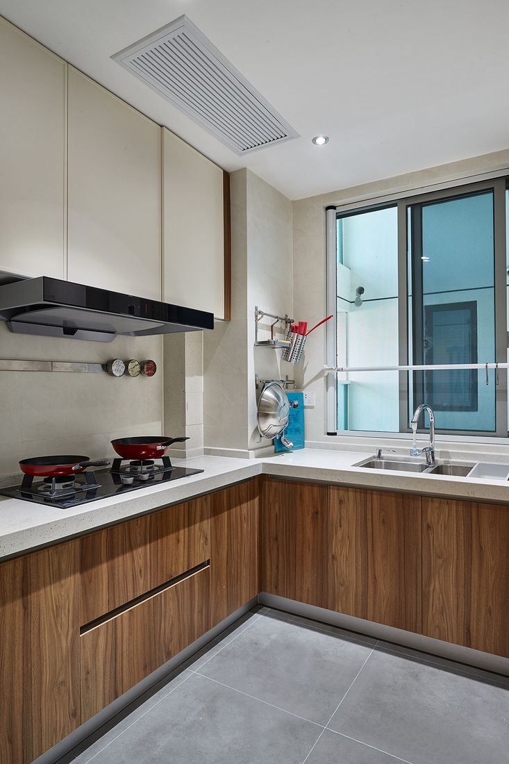 ▲ 廚房擁有豐富的儲物空間,原木色與白色的搭配,令廚房更加潔凈清爽。