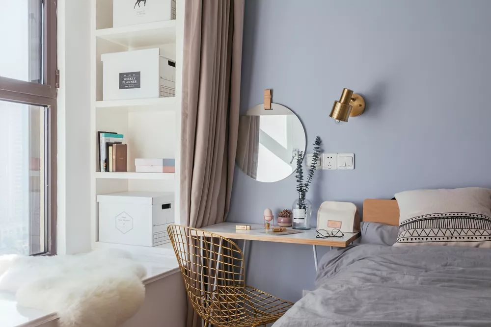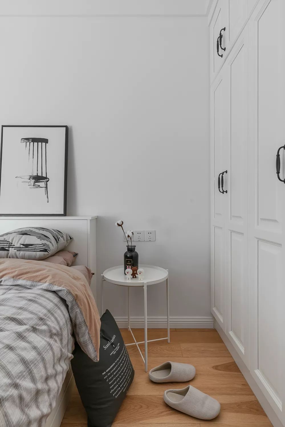 次臥的床是靠著窗戶擺放的,和衣柜之間的空間不大,所以用簡約款的小茶幾來代替床頭柜。整個次臥以灰色為主,搭配白色、木色,顯得簡潔大方。