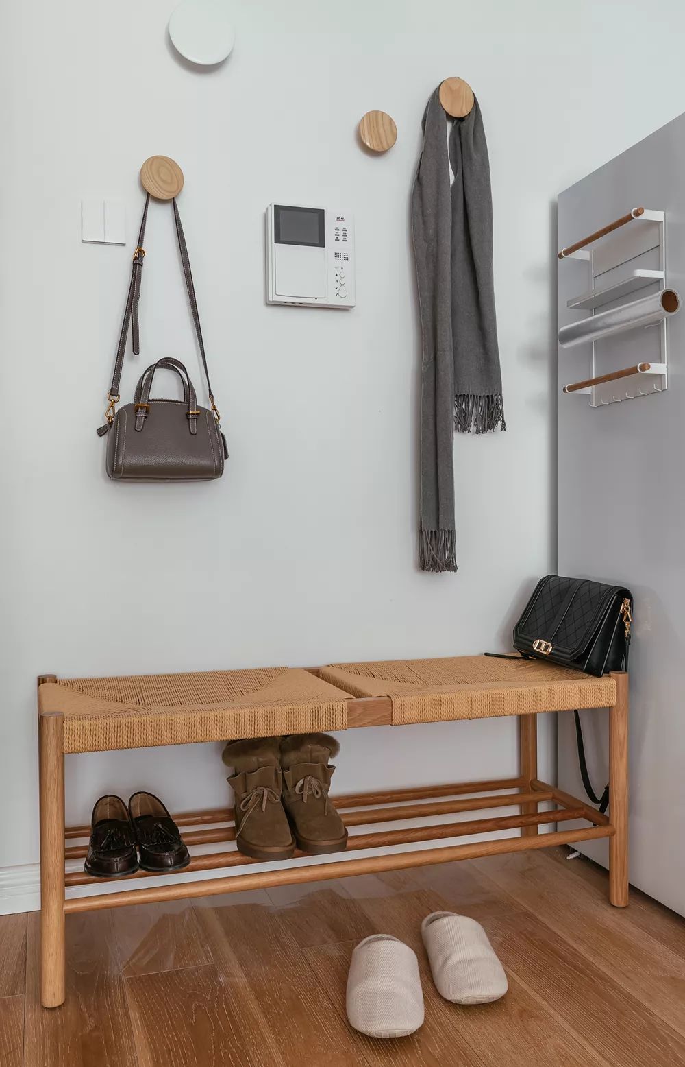 入戶沒有玄關(guān)走廊,在入戶門的一側(cè)擺放了換鞋凳和做了掛衣鉤,再加上冰箱上的置物架,也能滿足日常更換鞋子、衣服,擺放雜物的需求。