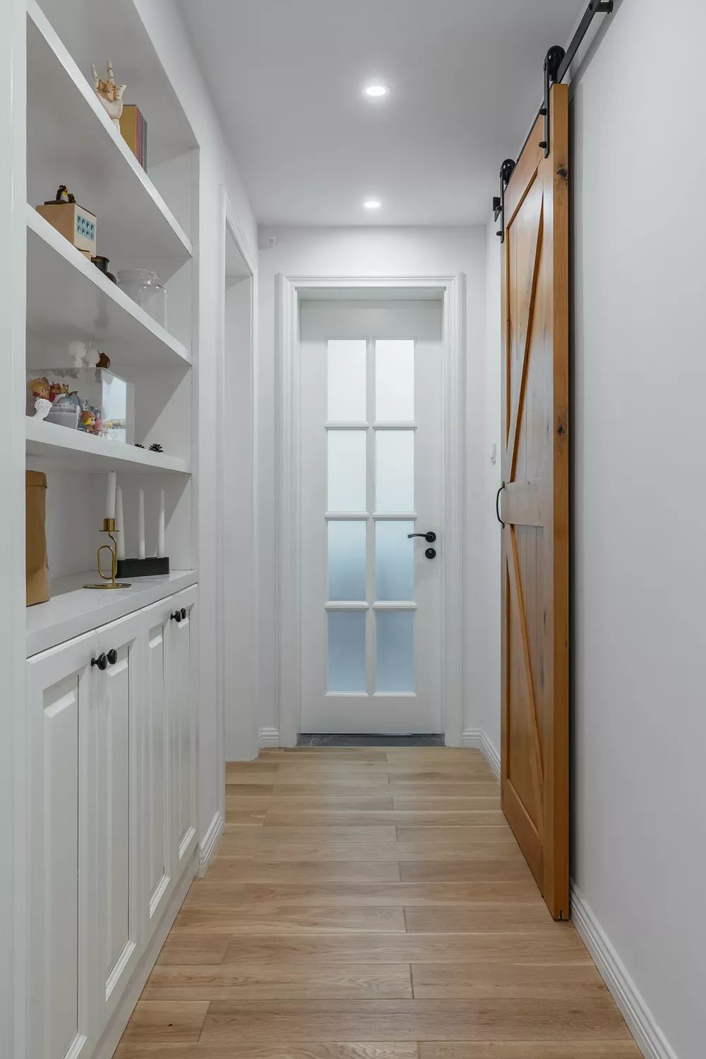 通往臥室的走廊也被充分的利用起來做了收納,嵌入式的柜子和隔板架的結(jié)合,方便擺放不同的東西。