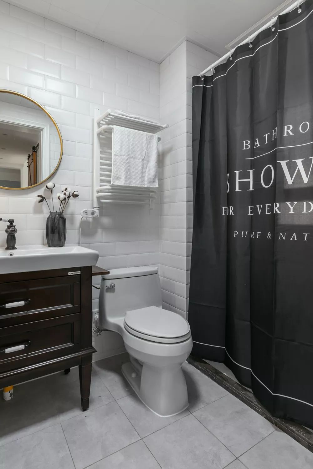 衛(wèi)生間內(nèi)部也是以灰白色為主,加入了黑色的浴簾和浴室柜,用浴簾加上擋水條來做干濕分離,更適合空間不大的小戶型衛(wèi)生間。