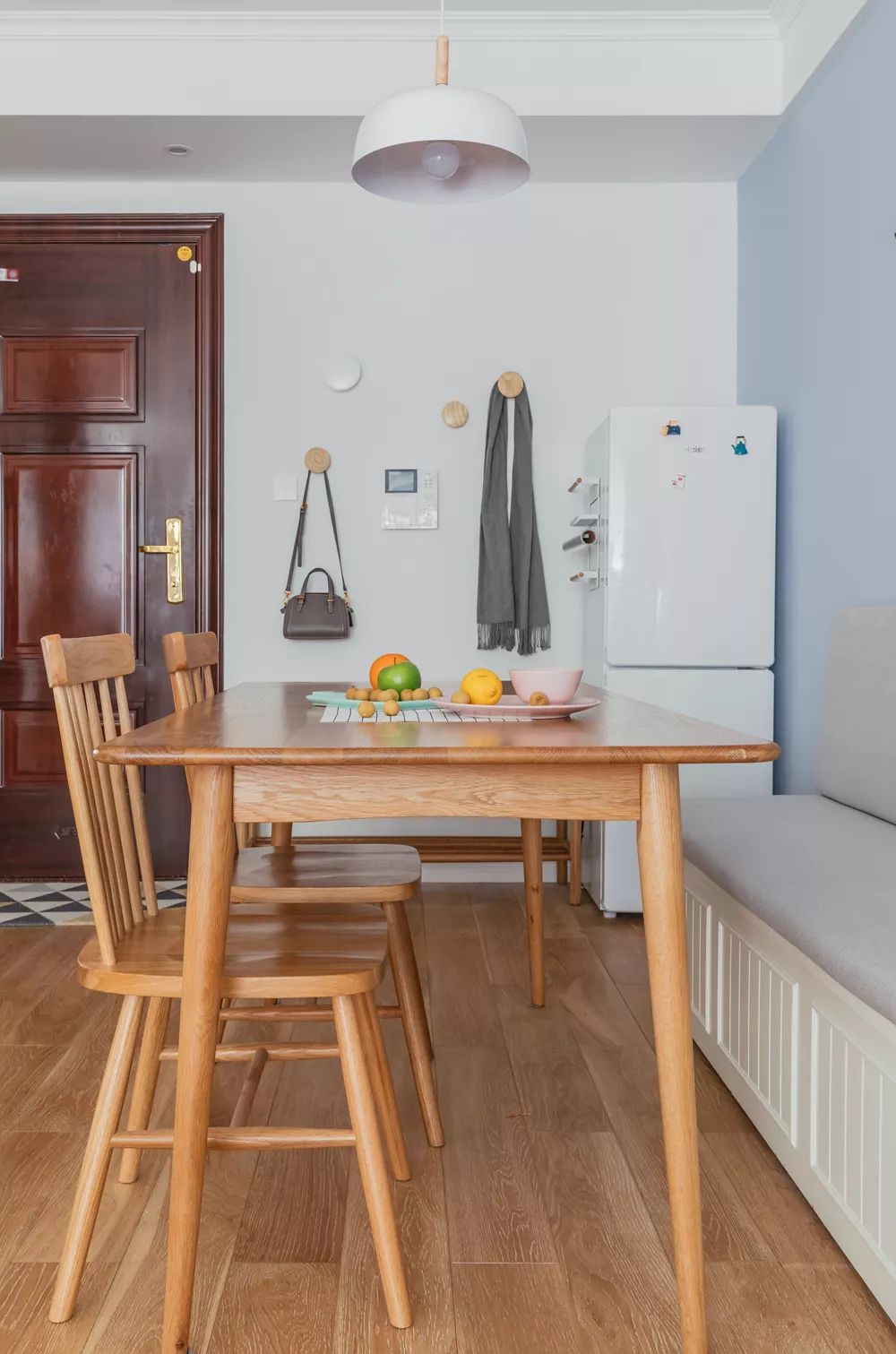 在換鞋凳邊上的就是卡座式的餐廳,藍(lán)灰色的軟包靠墊和藍(lán)色墻面結(jié)合起來,看起來非常舒服,卡座的設(shè)計(jì)也很適合小戶型,讓通道變得更寬敞。