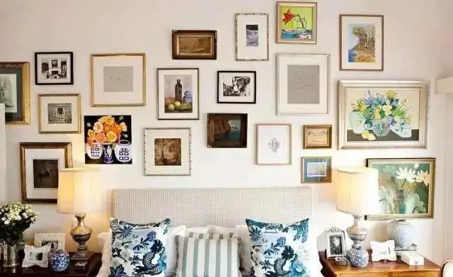 ①讓幾張畫框的下邊在一條水平線上。可以把尺寸最大的掛畫放在中間,左右補充尺寸稍小的掛畫,自由發(fā)揮即可,只要底邊在一條線上就不會顯得凌亂。
